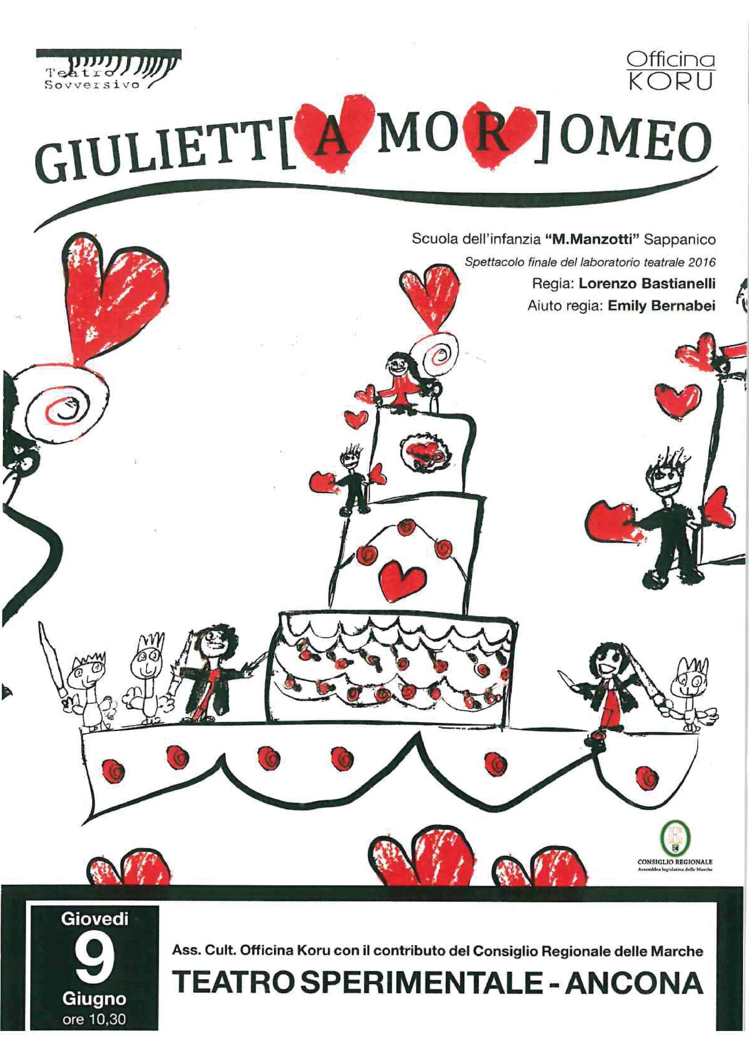 Questa storia, GIUUmA E ROMEO, non sarà mai come l’avete letta, non sarà mai come la conoscete, non sarà ma un film che avete già visto. Non affrettatevi a riconoscere quello e quell’altro, perché questa storia è frutto di quasi 50 altre storie. Una per ogni bambino, una per ogni bambina. Una per ogni cuore. Scordatevi Giulietta e Romeo. Questa è un’altra storia fatta di magia, amore, incontri, giochi, capricci, piccole voci, favole, sogni. leggerezza, luce, spade, urla, valigie, cuori, abbracci, baci, essenza.