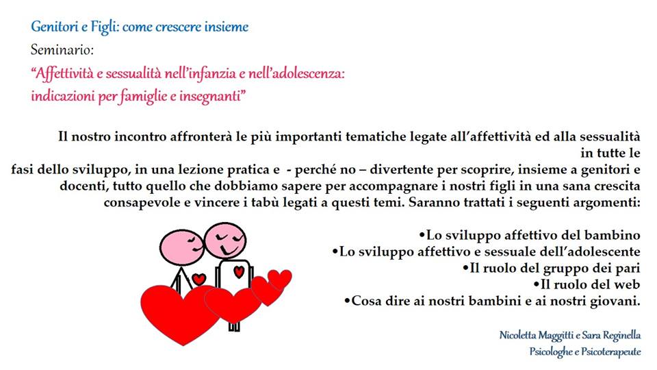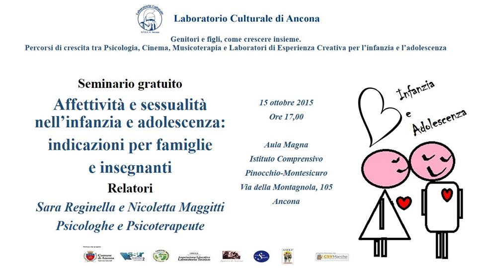 Il giorno 15 ottobre 2015 alle ore 17,00 presso i locali di Via Montagnola dell’Istituto Comprensivo Pinocchio Montesicuro si svolgerà un Seminario gratuito rivolto a tutti i genitori degli alunni delle scuole dell’Infanzia, Primarie e Secondaria di I gr. L’evento si svolge nell’ambito del progetto “Genitori e Figli come crescere insieme” ed avrà come tema “Affettività e sessualità nell’infanzia e adolescenza per famiglie e insegnanti“.